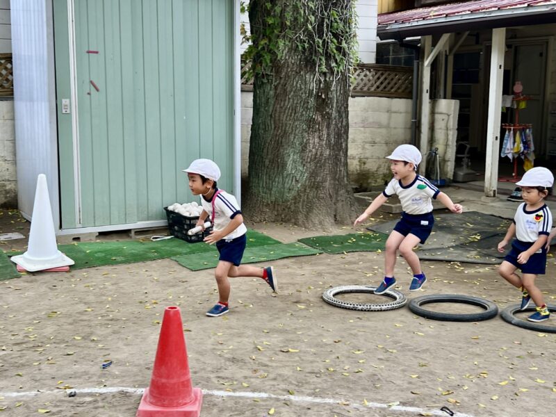 園に戻ると、年中がジュニアリレーをしていました。